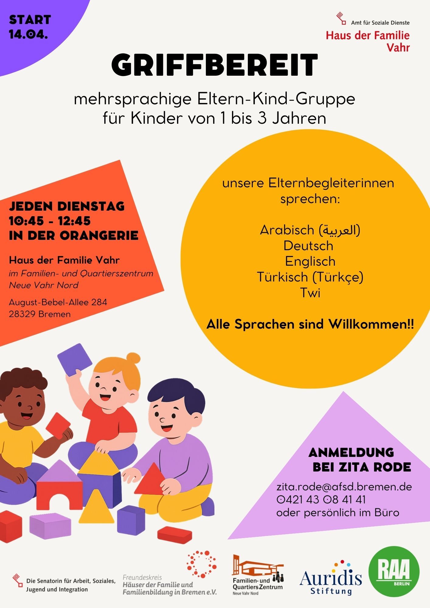 Singen und Spielen auf Deutsch und der Herkunftssprache mit Materialien für Zuhause. Unsere Elternbegleiterinnen sprechen Arabisch, Deutsch, Englisch, Türkisch und Twi. Alle Sprachen sind Willkommen!